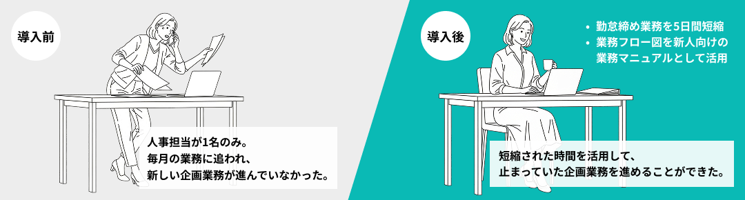 業務フローを全員で共有し議論できるようになったことで、ミスの防止につながり、新人教育にも活用できるようになりました。手順が明文化されることで、属人化を防ぎ、教育効率も向上します。